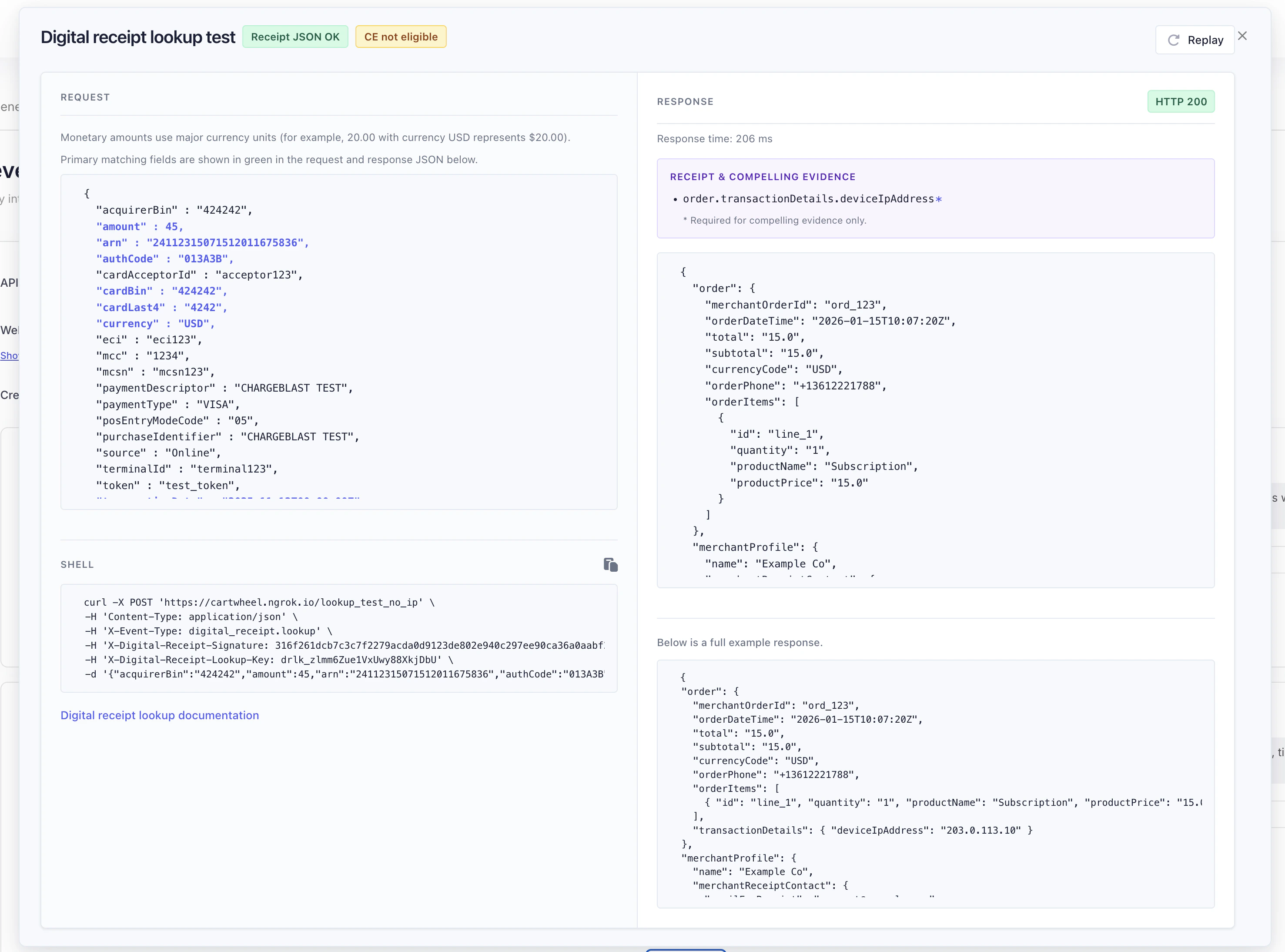 A response can be structurally valid (decodes to a receipt) but still fail compelling-evidence rules used for disputes. In particular:order.transactionDetails.deviceIpAddressis important for CE but not part of the minimal required-field list above.- Other CE-related gaps are derived from the mapped receipt shape (merchant descriptors, product description, customer identifiers, delivery address, etc.).